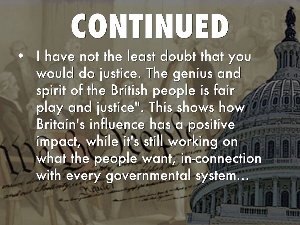 I have not the least doubt that you would do justice. The genius and spirit of the British people is fair play and justice". This shows how Britain's influence has a positive impact, while it's still working on what the people want, in-connection with every governmental system...