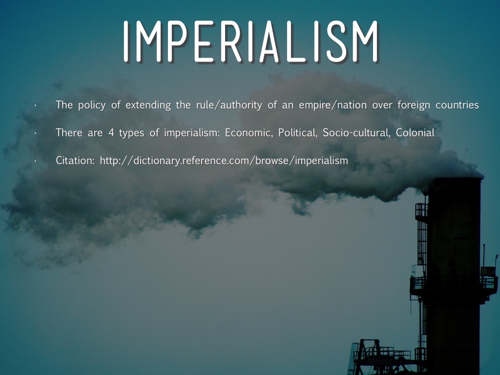 There are 4 types of imperialism: Economic, Political, Socio-cultural, Colonial