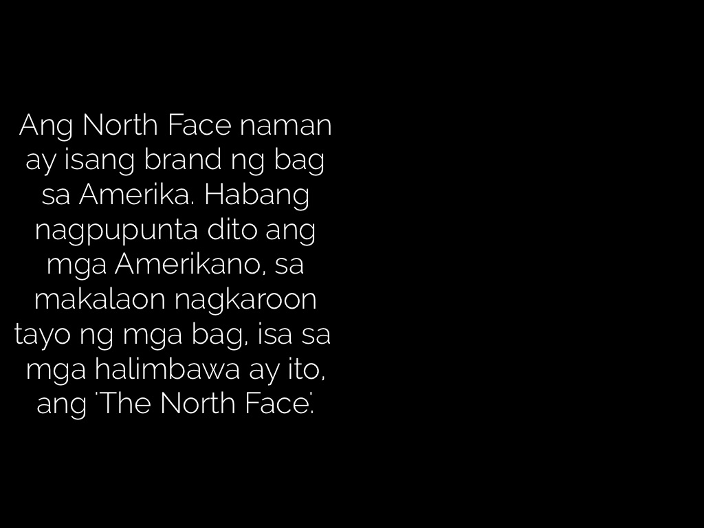 Ang North Face naman ay isang brand ng bag sa Amerika. Habang nagpupunta dito ang mga Amerikano, sa makalaon nagkaroon tayo ng mga bag, isa sa mga halimbawa ay ito, ang 'The North Face'.