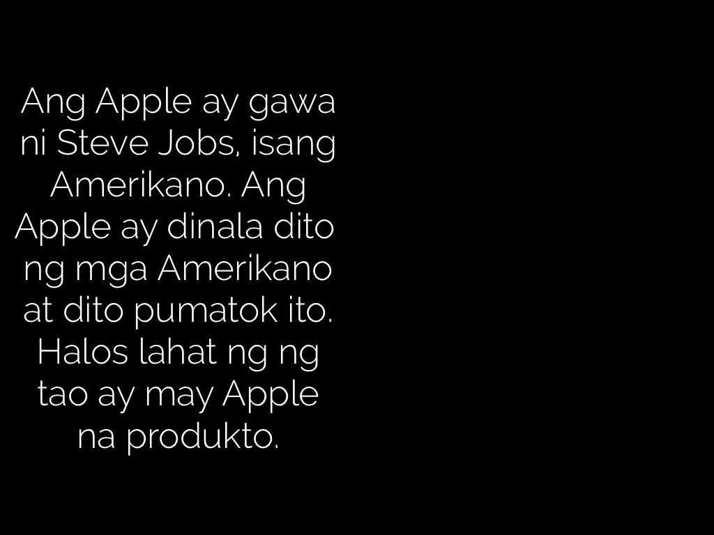 Ang Apple ay gawa ni Steve Jobs, isang Amerikano. Ang Apple ay dinala dito ng mga Amerikano at dito pumatok ito. Halos lahat ng ng tao ay may Apple na produkto.