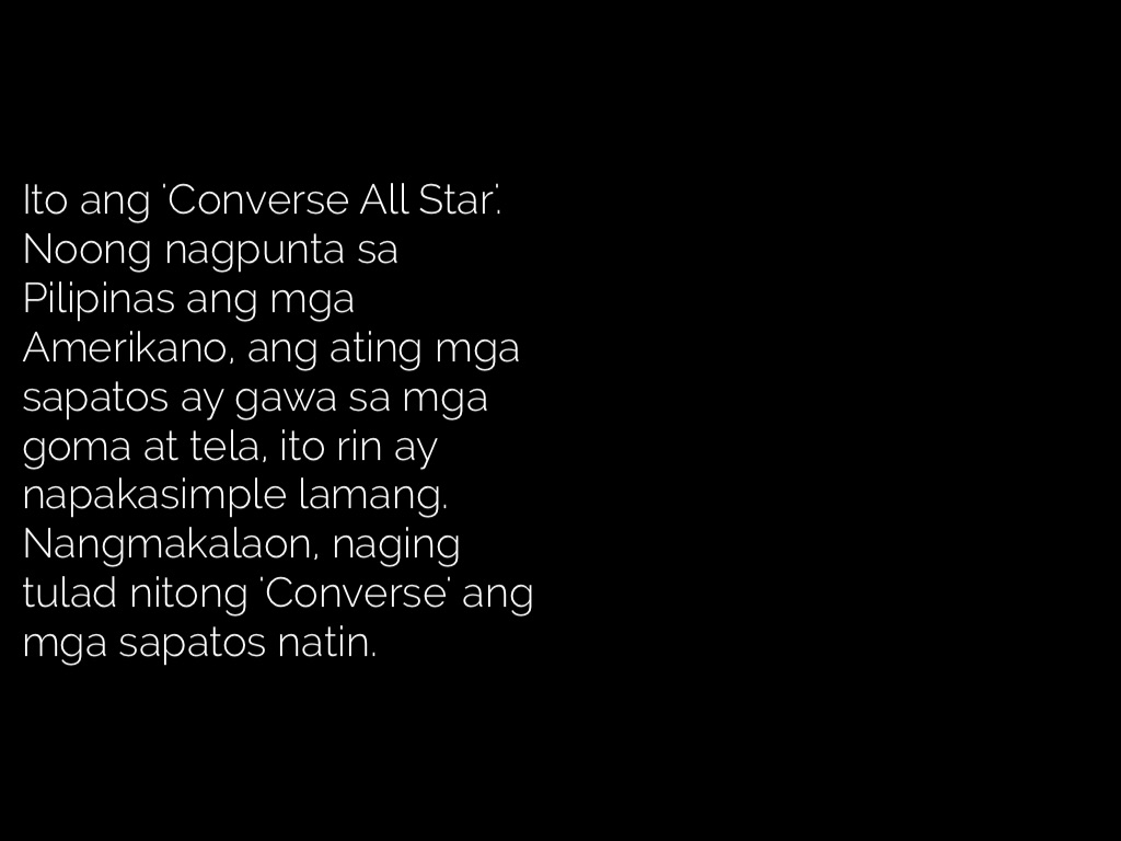 Ito ang 'Converse All Star'. Noong nagpunta sa Pilipinas ang mga Amerikano, ang ating mga sapatos ay gawa sa mga goma at tela, ito rin ay napakasimple lamang. Nangmakalaon, naging tulad nitong 'Converse' ang mga sapatos natin.