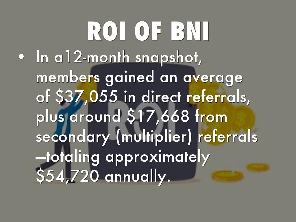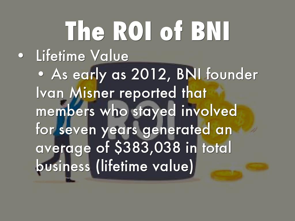 • As early as 2012, BNI founder Ivan Misner reported that members who stayed involved for seven years generated an average of $383,038 in total business (lifetime value)