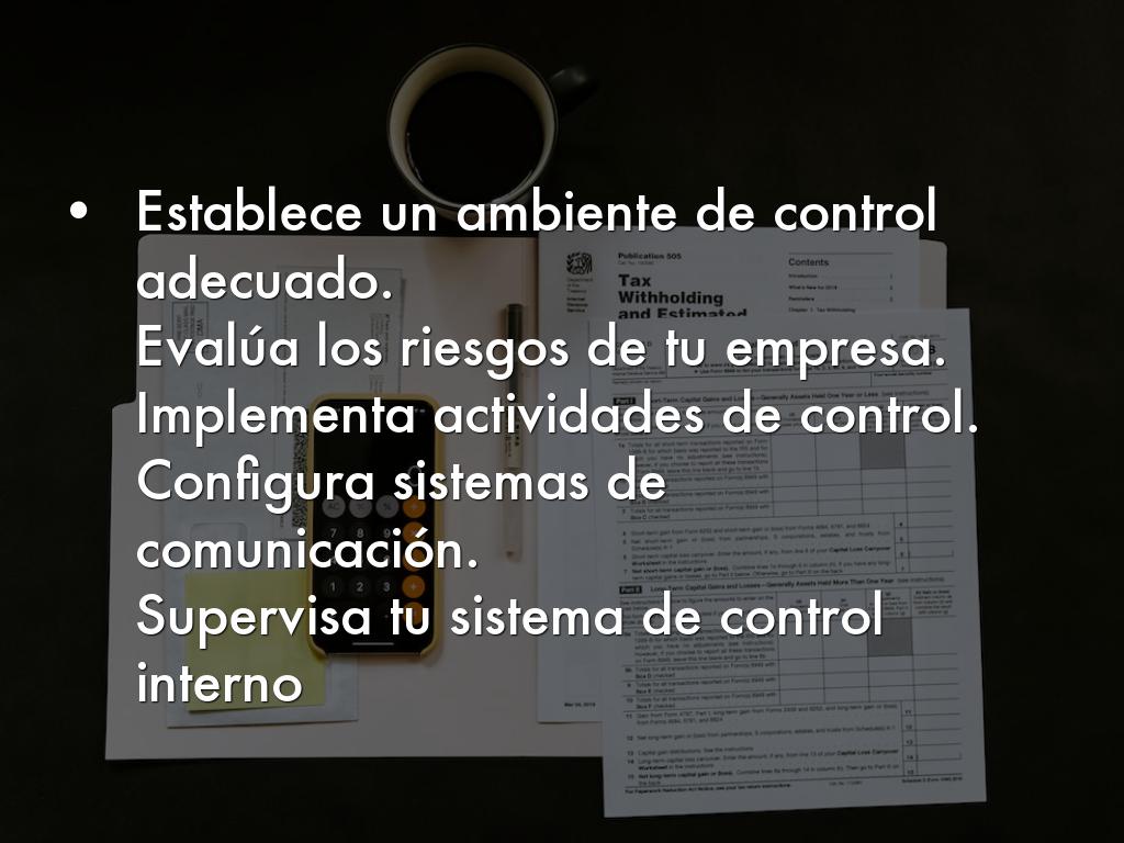 • Establece un ambiente de control adecuado. Evalúa los riesgos de tu empresa. Implementa actividades de control. Configura sistemas de comunicación. Supervisa tu sistema de control interno