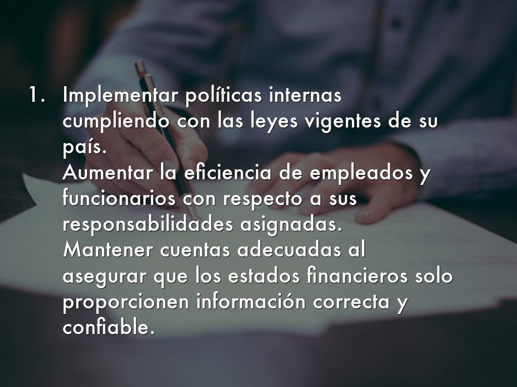 • Implementar políticas internas cumpliendo con las leyes vigentes de su país. Aumentar la eficiencia de empleados y funcionarios con respecto a sus responsabilidades asignadas. Mantener cuentas adecuadas al asegurar que los estados financieros solo proporcionen información correcta y confiable. Salvaguardar los activos comerciales de robo o de la mala gestión de recursos. Asegurar el cumplimiento de las políticas comerciales y la ley del país. Evaluar las funciones de cada empleado y funcionario para aumentar la eficiencia en la operación. Asegurar datos operativos y estados financieros verdaderos y confiables.