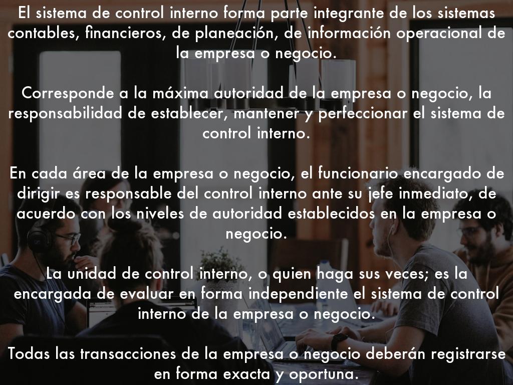 El sistema de control interno forma parte integrante de los sistemas contables, financieros, de planeación, de información operacional de la empresa o negocio.