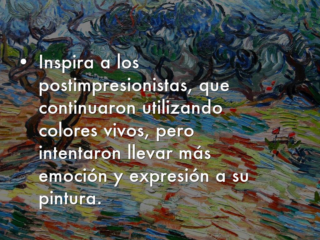 - Inspira a los postimpresionistas, que continuaron utilizando colores vivos, pero intentaron llevar más emoción y expresión a su pintura.