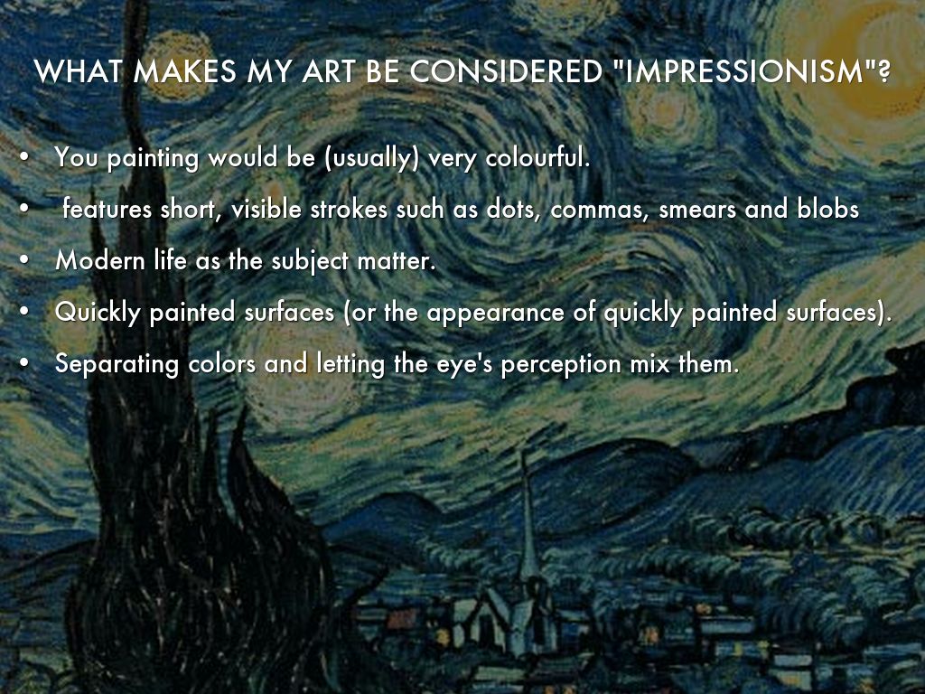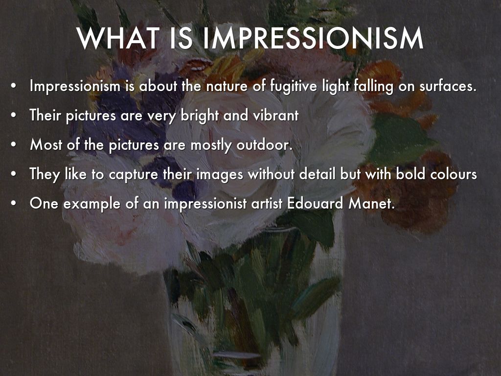 - Impressionism is about the nature of fugitive light falling on surfaces.