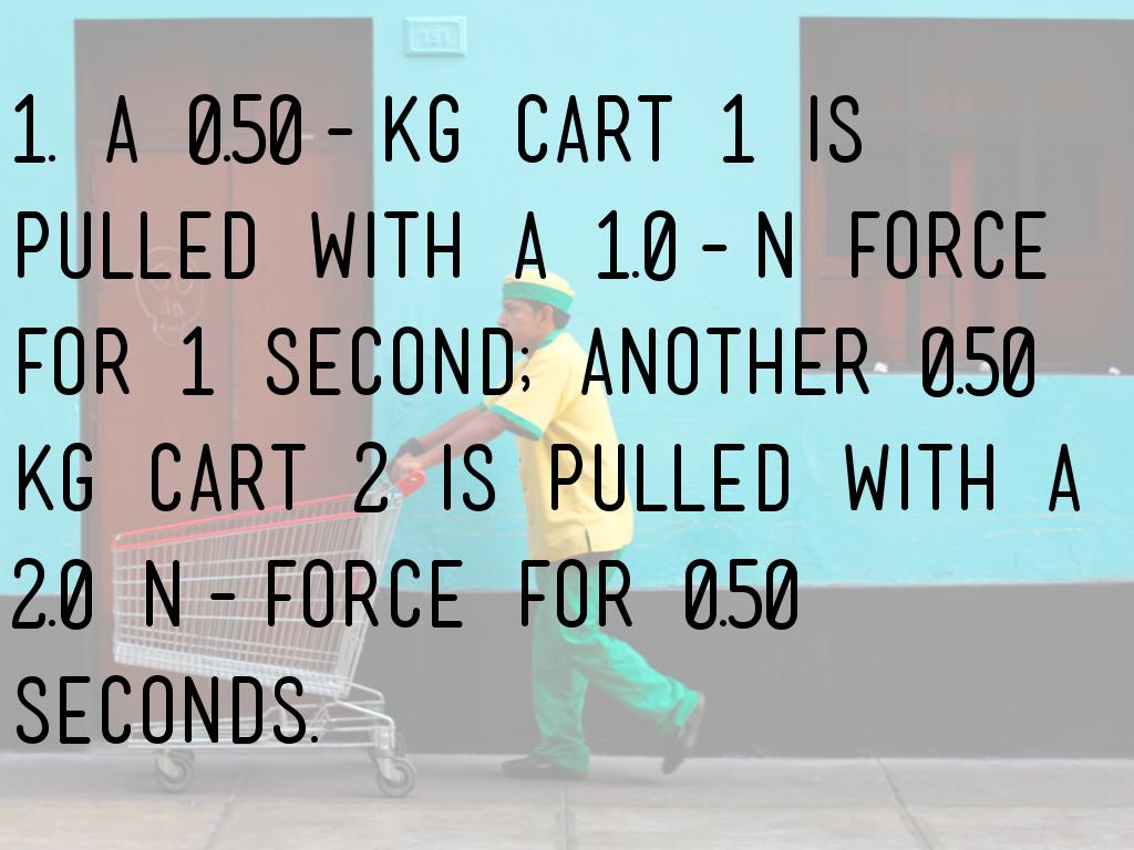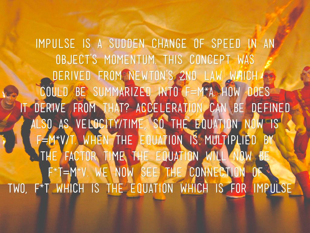 IMPULSE is a SUDDEN CHANGE OF SPEED in an OBJECT'S MOMENTUM. This concept was DERIVED FROM NEWTON'S 2ND LAW which could be summarized into F=M*A. How does It derive from that? ACCELERATION can be DEFINED also as VELOCITY/TIME, so the equation now is F=m*v/t. When the equation is multiplied by the factor time the equation will now be F*t=m*v. We now see the connection of two, F*t which is the equation which is for impulse…