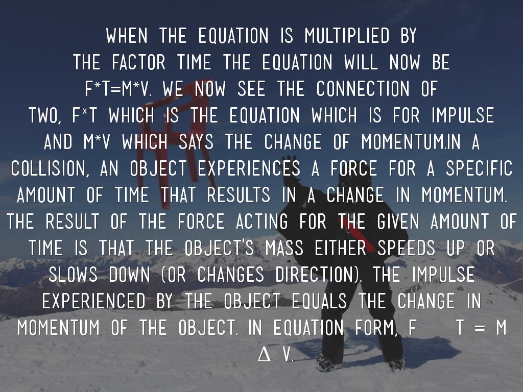 When the equation is multiplied by the factor time the equation will now be F*t=m*v. We now see the connection of two, F*t which is the equation which is for impulse and m*v which says the change of momentum.In a collision, an object experiences a force for a specific amount of time that results in a change in momentum. The result of the force acting for the given amount of time is that the object's mass either speeds up or slows down (or changes direction). The impulse experienced by the object equals the change in momentum of the object. In equation form, F • t = m • Δ v.