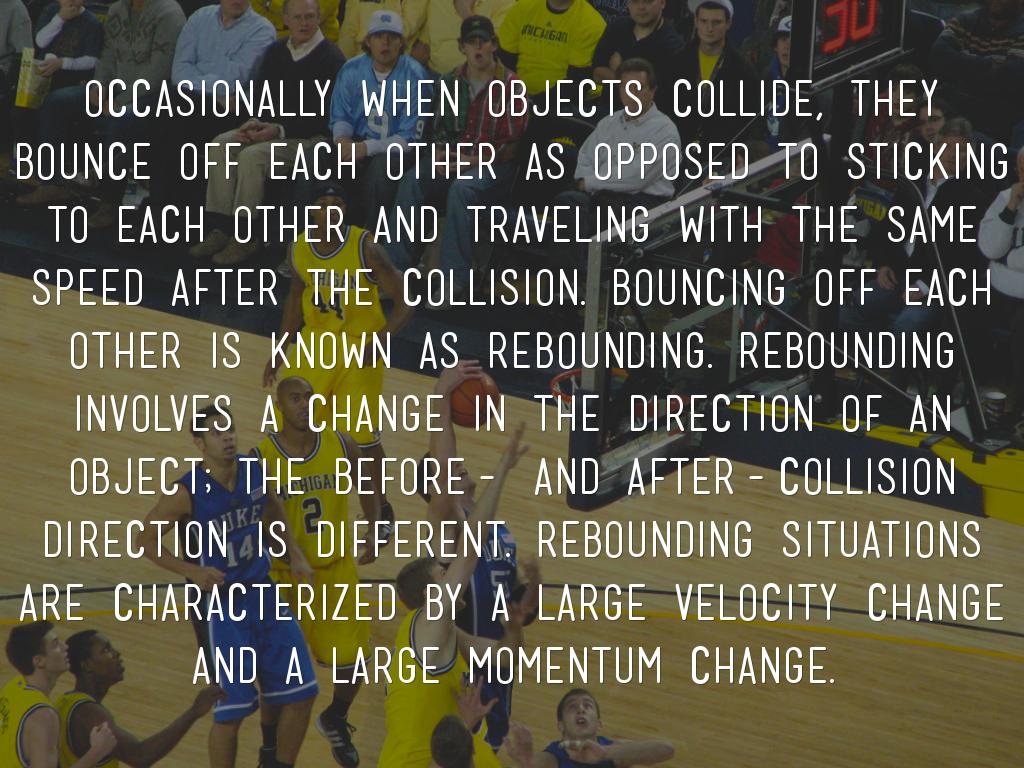Occasionally when objects collide, they bounce off each other as opposed to sticking to each other and traveling with the same speed after the collision. Bouncing off each other is known as REBOUNDING. Rebounding involves a change in the direction of an object; the before- and after-collision direction is different. Rebounding situations are characterized by a large velocity change and a large momentum change.