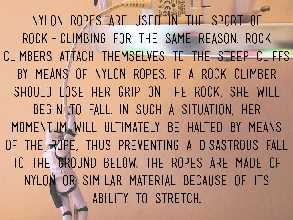 Nylon ropes are used in the sport of rock-climbing for the same reason. Rock climbers attach themselves to the steep cliffs by means of nylon ropes. If a rock climber should lose her grip on the rock, she will begin to fall. In such a situation, her momentum will ultimately be halted by means of the rope, thus preventing a disastrous fall to the ground below. The ropes are made of nylon or similar material because of its ability to stretch.