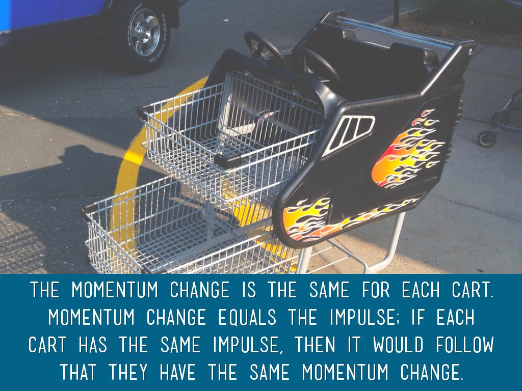The momentum change is the same for each cart. Momentum change equals the impulse; if each cart has the same impulse, then it would follow that they have the same momentum change.