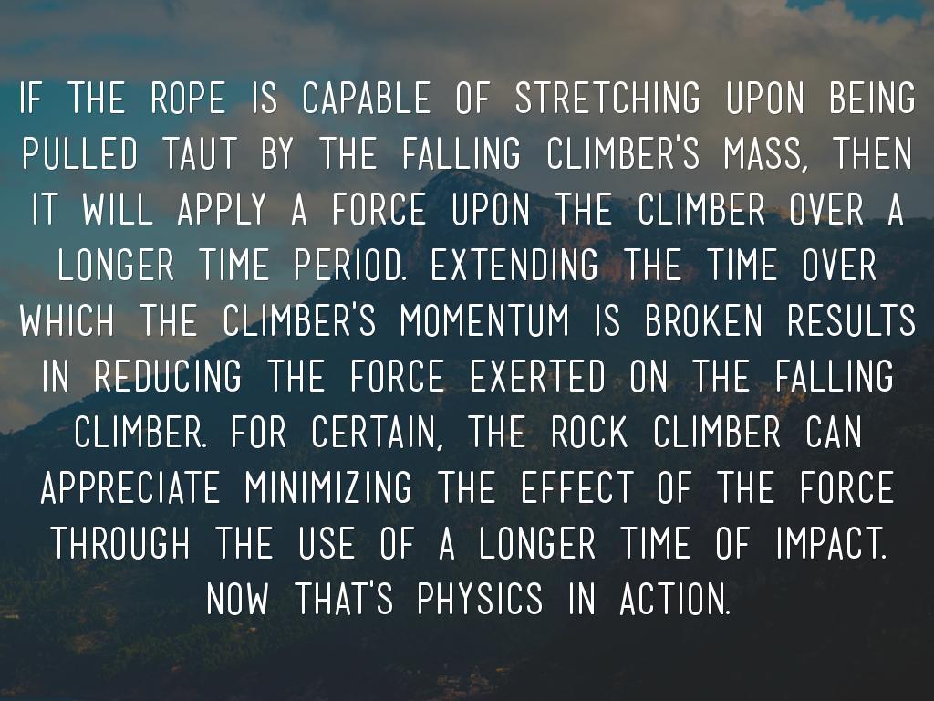 If the rope is capable of stretching upon being pulled taut by the falling climber's mass, then it will apply a force upon the climber over a longer time period. Extending the time over which the climber's momentum is broken results in reducing the force exerted on the falling climber. For certain, the rock climber can appreciate minimizing the effect of the force through the use of a longer time of impact. Now that's physics in action.