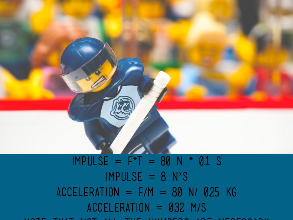 Impulse = F*t = 80 N * 0.1 s Impulse = 8 N*s Acceleration = F/m = 80 N/ 0.25 kg Acceleration = 0.32 m/s Note that not all the numbers are necessary for computing the impulse; don't "force" the value of mass into the computation.