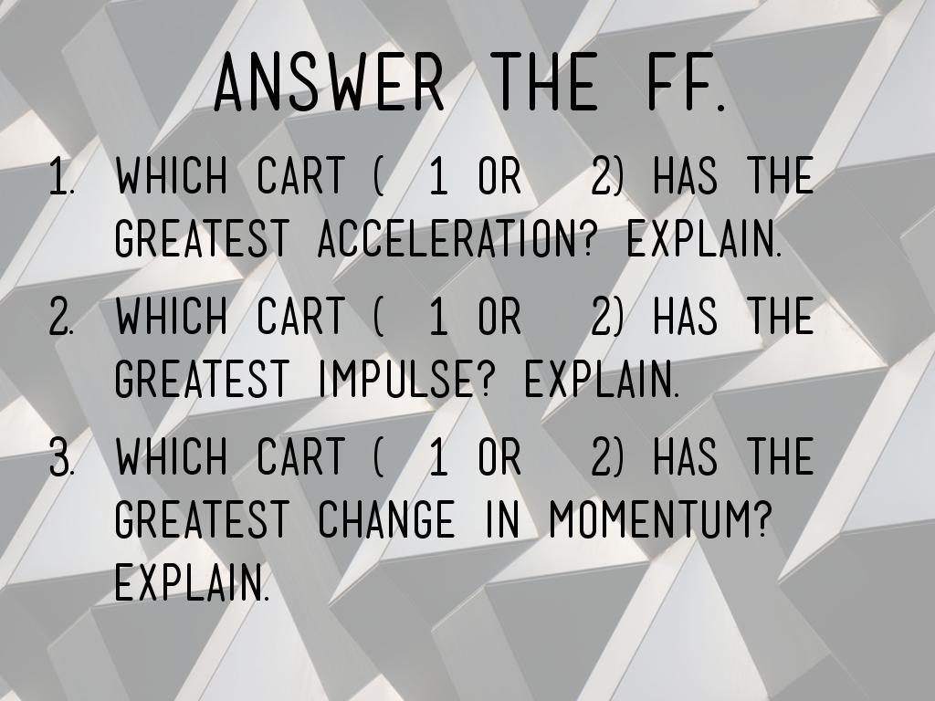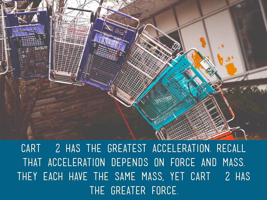 Cart #2 has the greatest acceleration. Recall that acceleration depends on force and mass. They each have the same mass, yet cart #2 has the greater force.