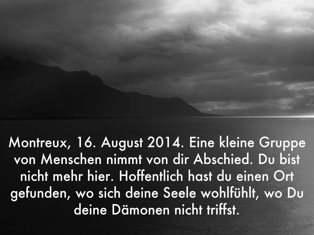Montreux, 16. August 2014. Eine kleine Gruppe von Menschen nimmt von dir Abschied. Du bist nicht mehr hier. Hoffentlich hast du einen Ort gefunden, wo sich deine Seele wohlfühlt, wo Du deine Dämonen nicht triffst.