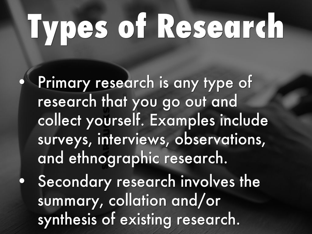Primary research is any type of research that you go out and collect yourself. Examples include surveys, interviews, observations, and ethnographic research.