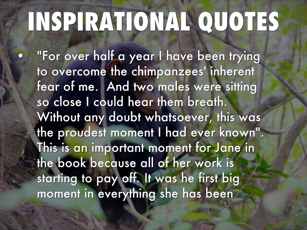 "For over half a year I have been trying to overcome the chimpanzees' inherent fear of me. And two males were sitting so close I could hear them breath. Without any doubt whatsoever, this was the proudest moment I had ever known". This is an important moment for Jane in the book because all of her work is starting to pay off. It was he first big moment in everything she has been working for. I think it's really cool that she could get so close to these wild animals without them caring.