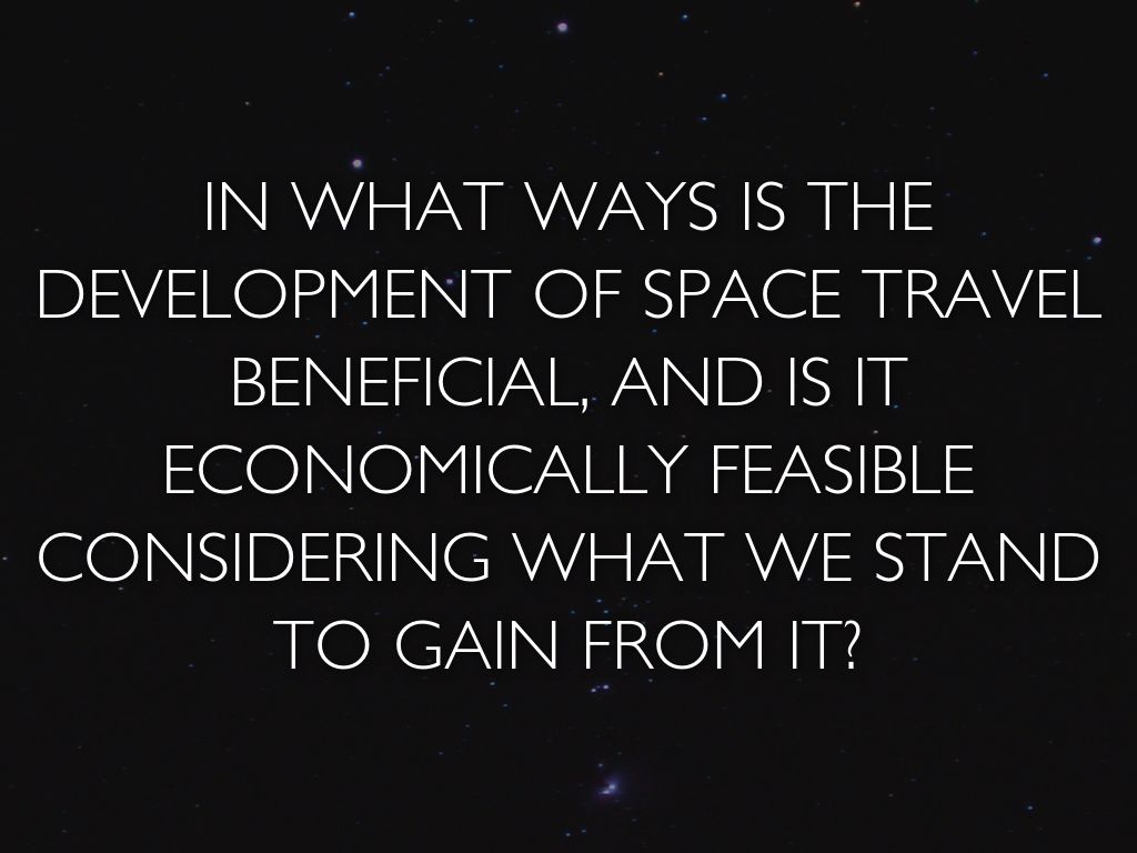 IN WHAT WAYS IS THE DEVELOPMENT OF SPACE TRAVEL BENEFICIAL, AND IS IT ECONOMICALLY FEASIBLE CONSIDERING WHAT WE STAND TO GAIN FROM IT?