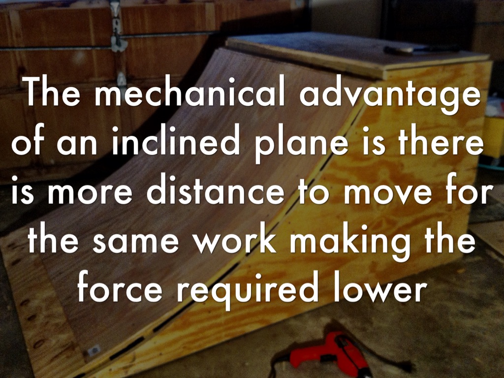 The mechanical advantage of an inclined plane is there is more distance to move for the same work making the force required lower