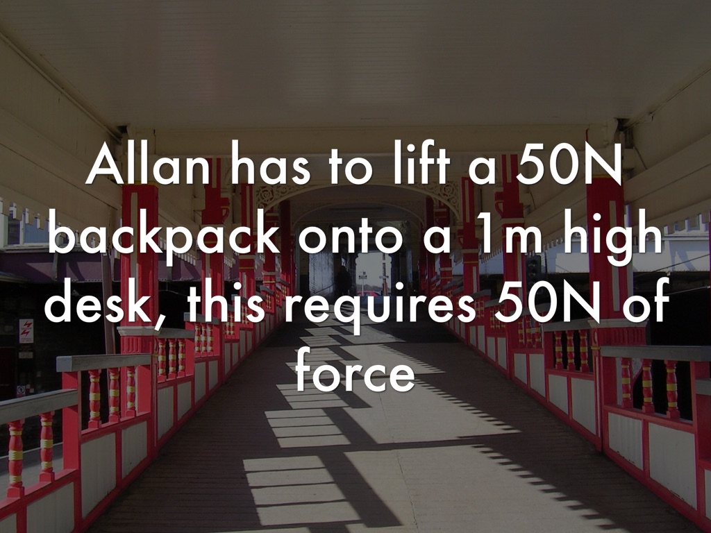 Allan has to lift a 50N backpack onto a 1m high desk, this requires 50N of force