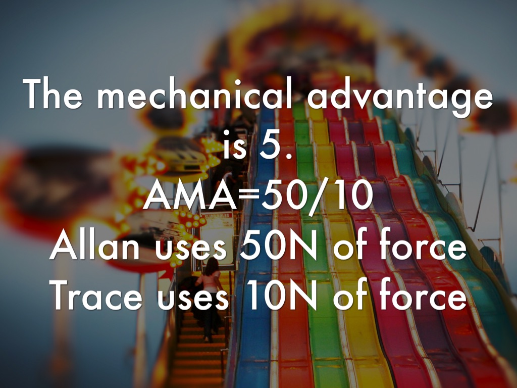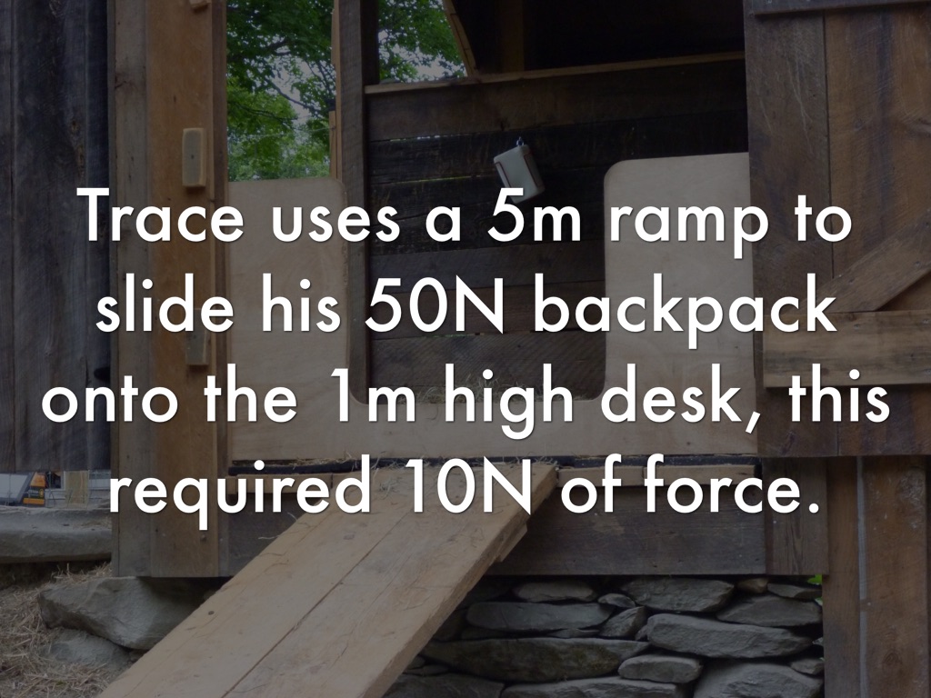 Trace uses a 5m ramp to slide his 50N backpack onto the 1m high desk, this required 10N of force.