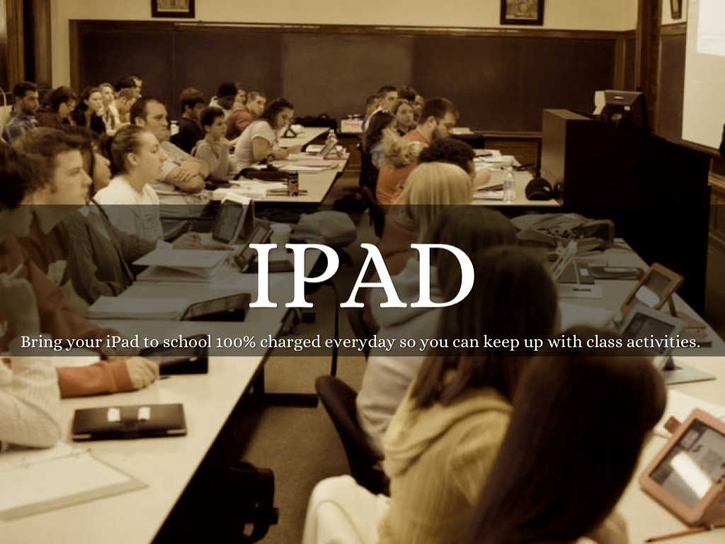 Bring your iPad to school 100% charged everyday so you can keep up with class activities.