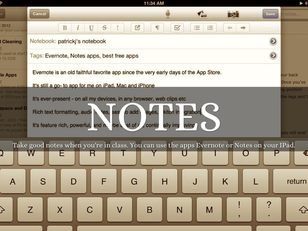 Take good notes when you're in class. You can use the apps Evernote or Notes on your IPad.