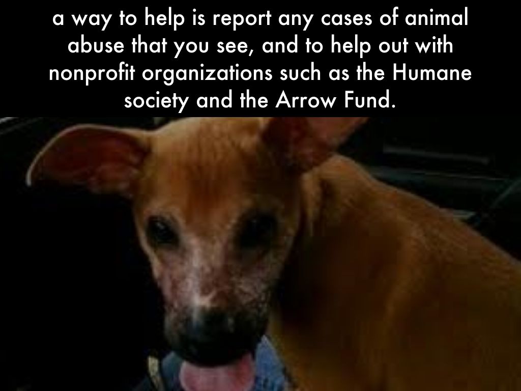 a way to help is report any cases of animal abuse that you see, and to help out with nonprofit organizations such as the Humane society and the Arrow Fund.