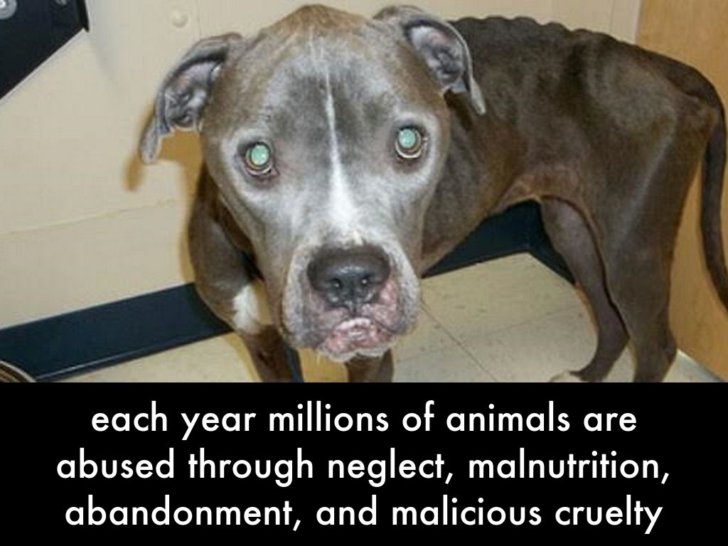 each year millions of animals are abused through neglect, malnutrition, abandonment, and malicious cruelty