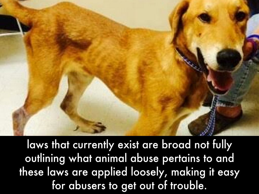 laws that currently exist are broad not fully outlining what animal abuse pertains to and these laws are applied loosely, making it easy for abusers to get out of trouble.