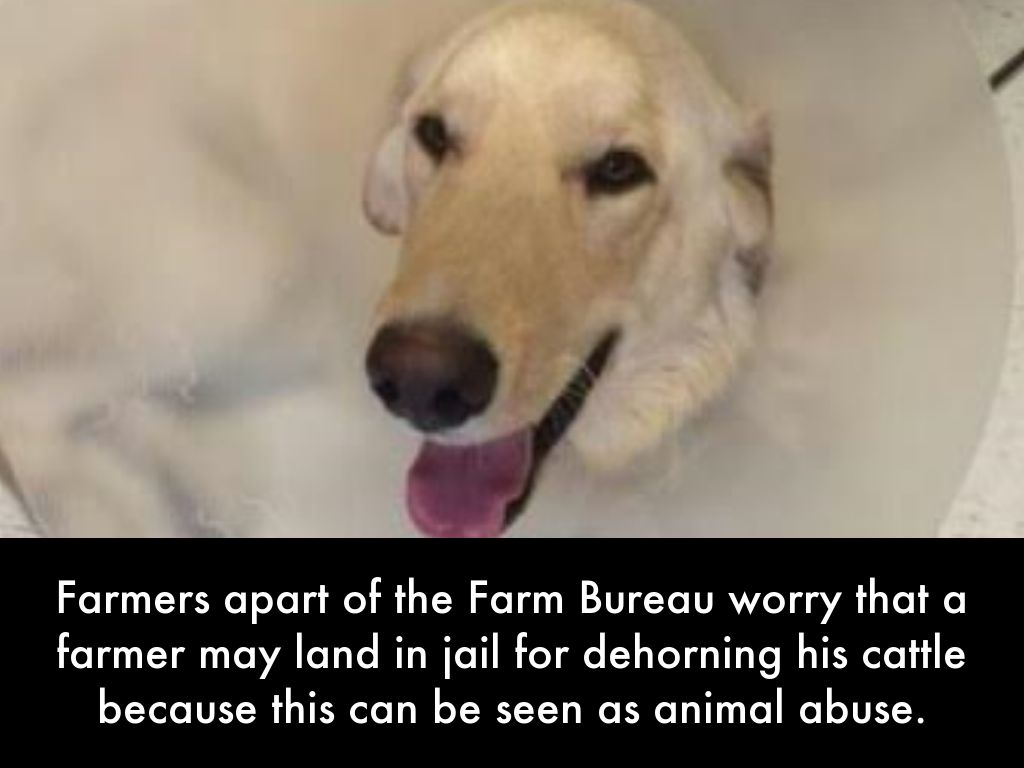 Farmers apart of the Farm Bureau worry that a farmer may land in jail for dehorning his cattle because this can be seen as animal abuse.