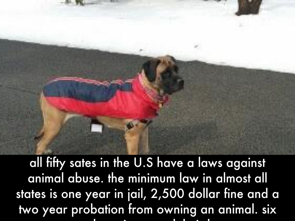 all fifty sates in the U.S have a laws against animal abuse. the minimum law in almost all states is one year in jail, 2,500 dollar fine and a two year probation from owning an animal. six states have increased their laws.
