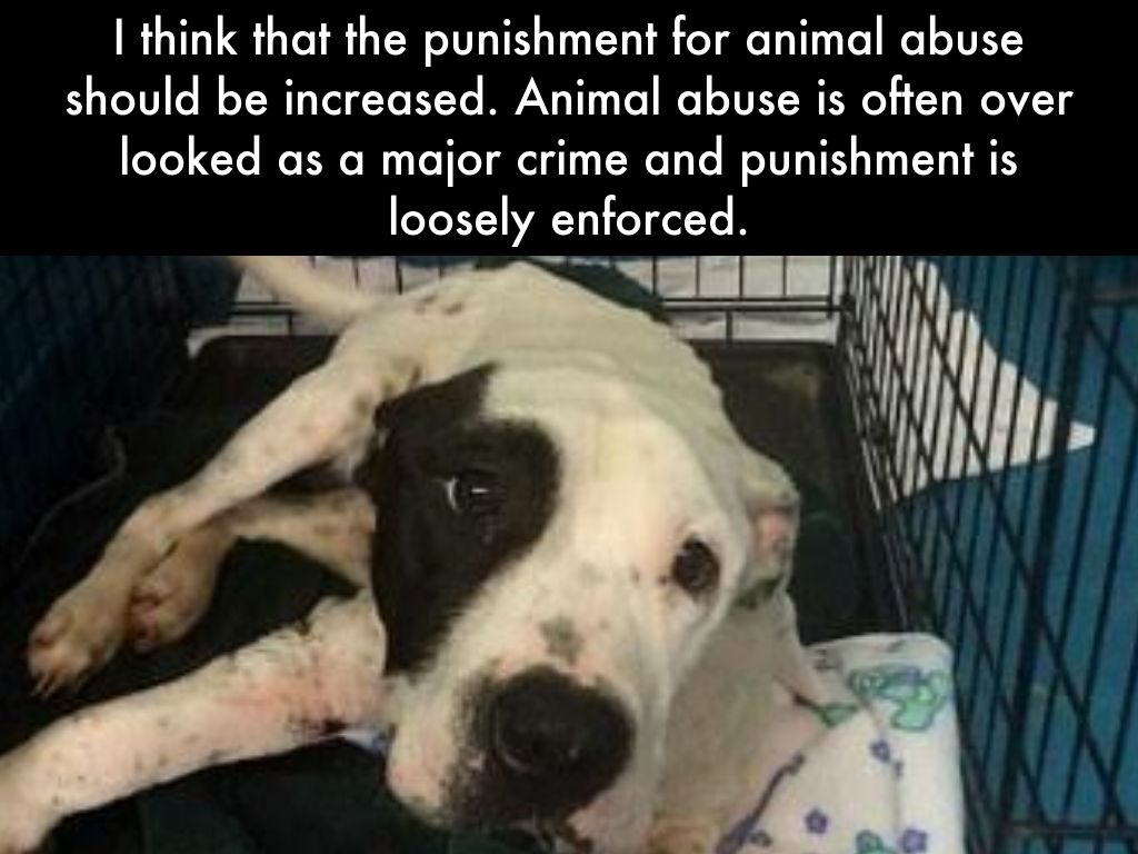I think that the punishment for animal abuse should be increased. Animal abuse is often over looked as a major crime and punishment is loosely enforced.