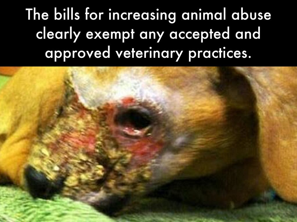 The bills for increasing animal abuse clearly exempt any accepted and approved veterinary practices.