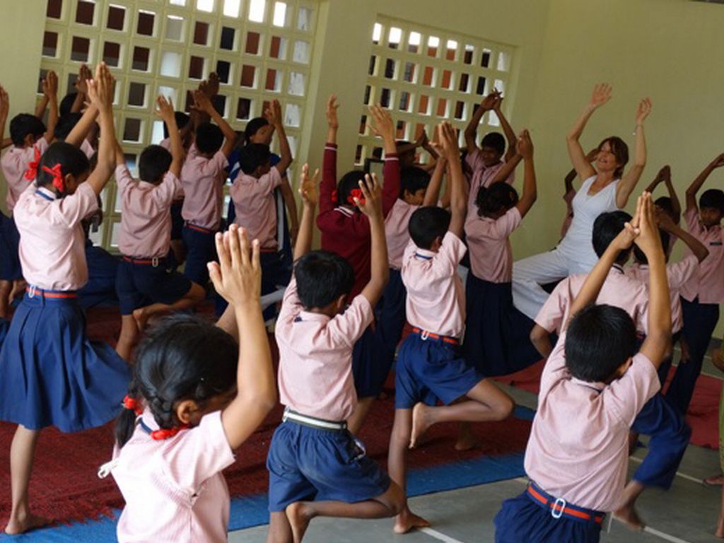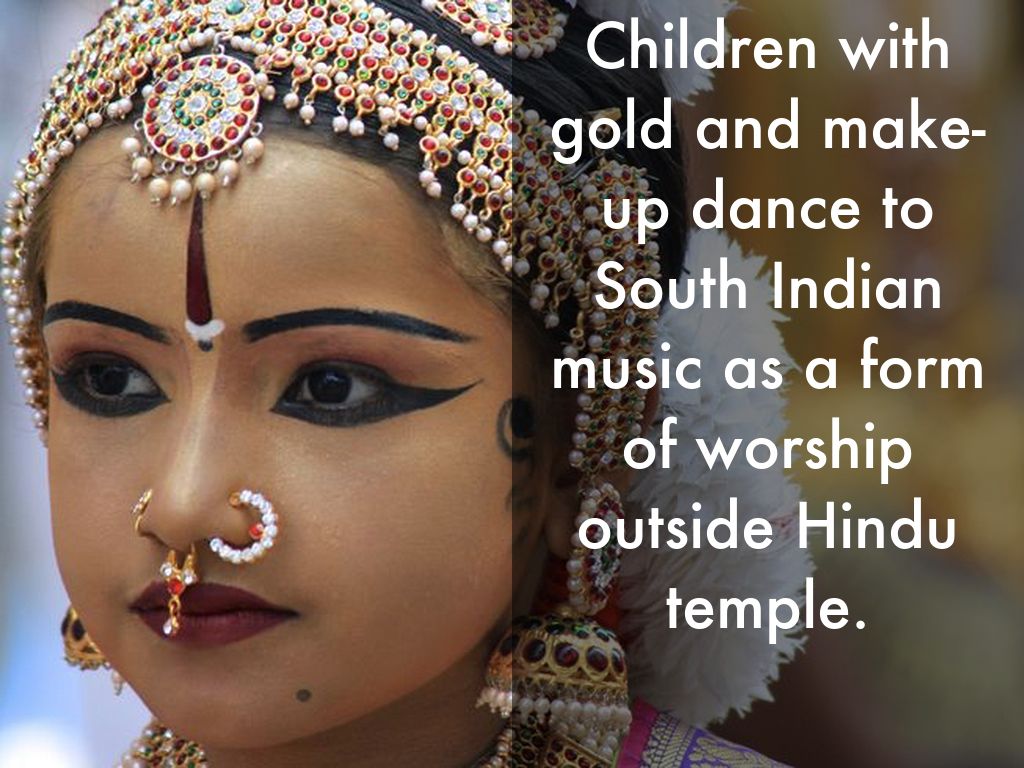 Children with gold and make-up dance to South Indian music as a form of worship outside Hindu temple.