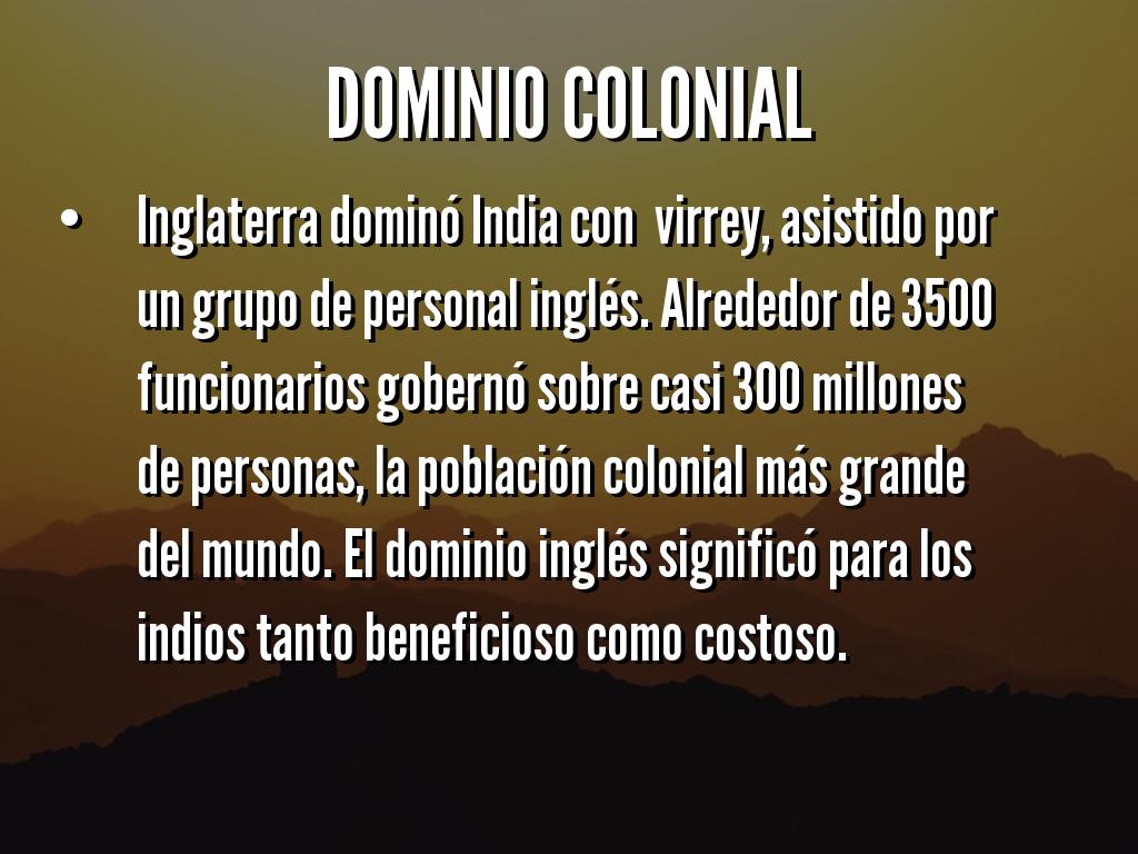 Inglaterra dominó India con virrey, asistido por un grupo de personal inglés. Alrededor de 3500 funcionarios gobernó sobre casi 300 millones de personas, la población colonial más grande del mundo. El dominio inglés significó para los indios tanto beneficioso como costoso.
