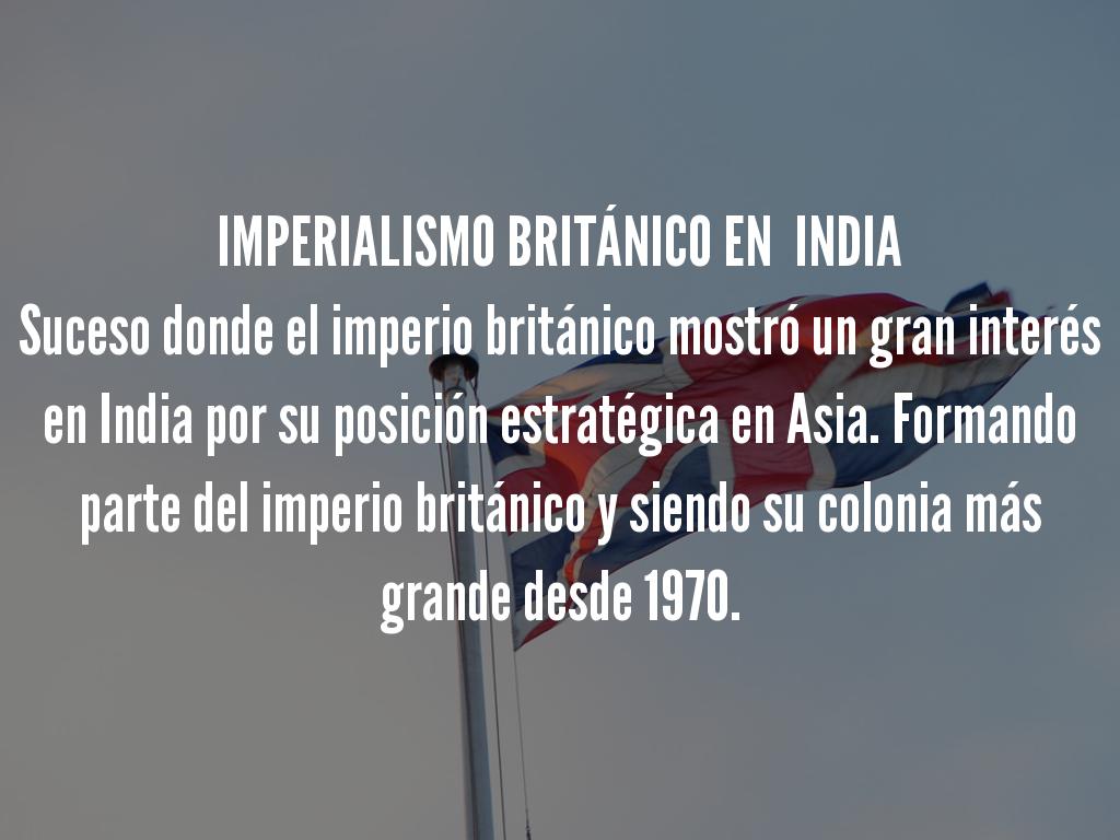 IMPERIALISMO BRITÁNICO EN INDIA Suceso donde el imperio británico mostró un gran interés en India por su posición estratégica en Asia. Formando parte del imperio británico y siendo su colonia más grande desde 1970.