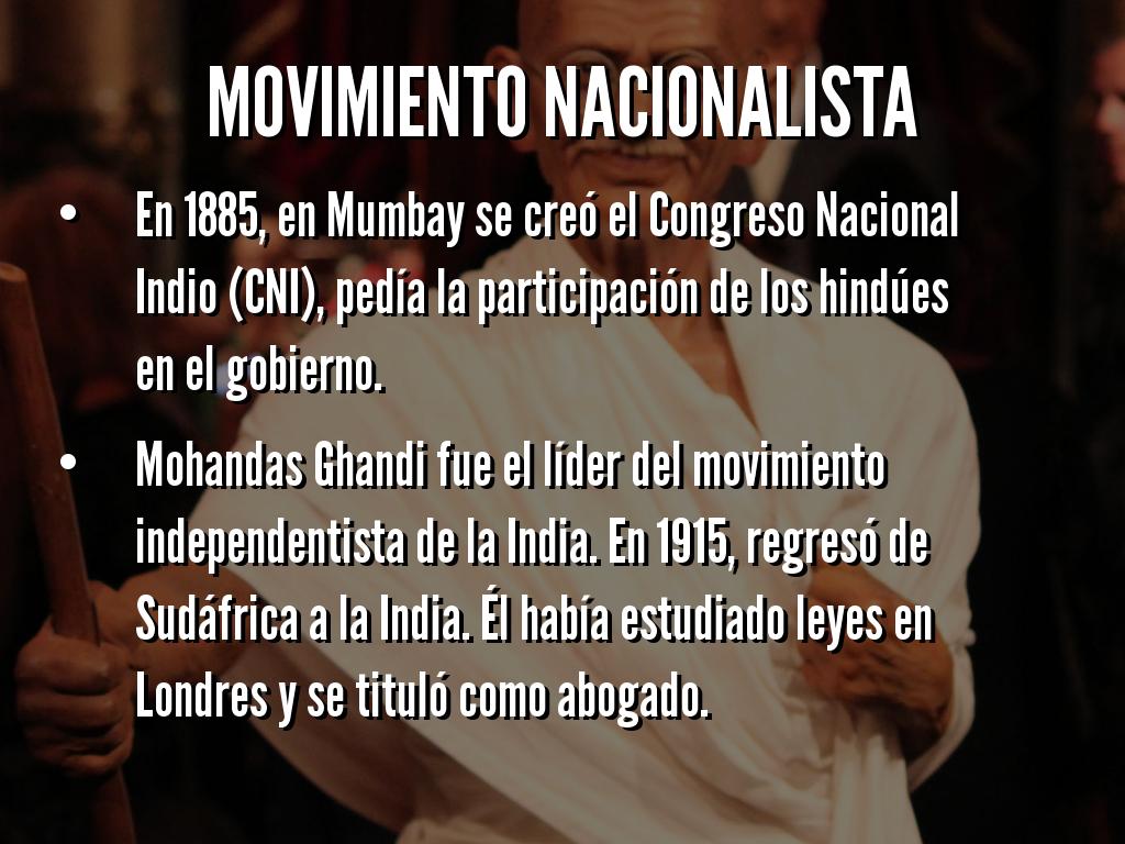 Mohandas Ghandi fue el líder del movimiento independentista de la India. En 1915, regresó de Sudáfrica a la India. Él había estudiado leyes en Londres y se tituló como abogado.