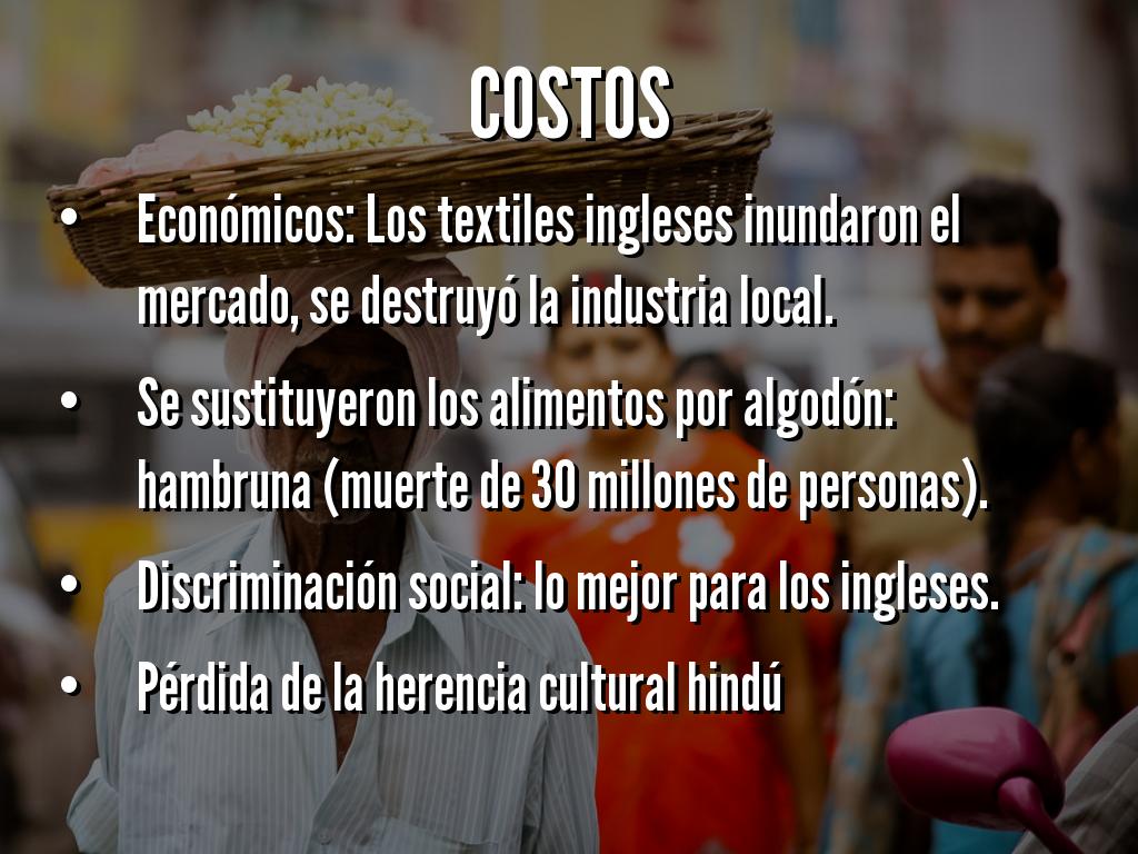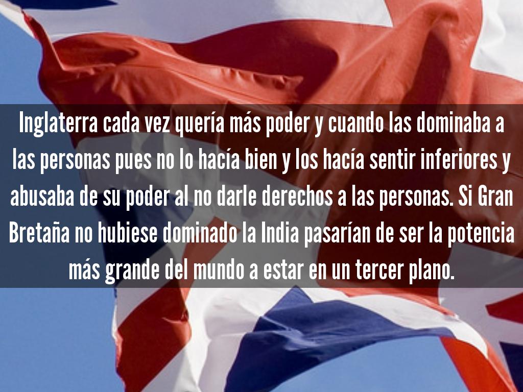 Inglaterra cada vez quería más poder y cuando las dominaba a las personas pues no lo hacía bien y los hacía sentir inferiores y abusaba de su poder al no darle derechos a las personas. Si Gran Bretaña no hubiese dominado la India pasarían de ser la potencia más grande del mundo a estar en un tercer plano.