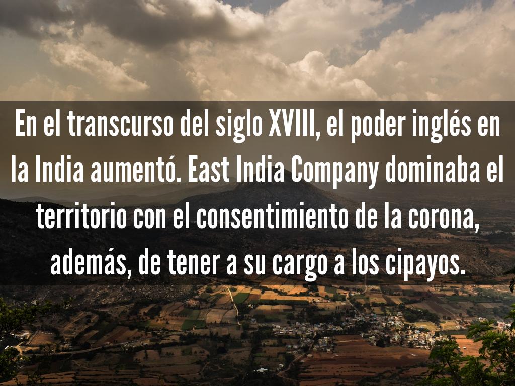 En el transcurso del siglo XVIII, el poder inglés en la India aumentó. East India Company dominaba el territorio con el consentimiento de la corona, además, de tener a su cargo a los cipayos.