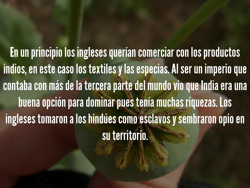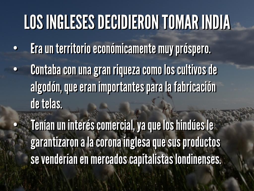 En un principio los ingleses querían comerciar con los productos indios, en este caso los textiles y las especias. Al ser un imperio que contaba con más de la tercera parte del mundo vio que India era una buena opción para dominar pues tenía muchas riquezas. Los ingleses tomaron a los hindúes como esclavos y sembraron opio en su territorio.