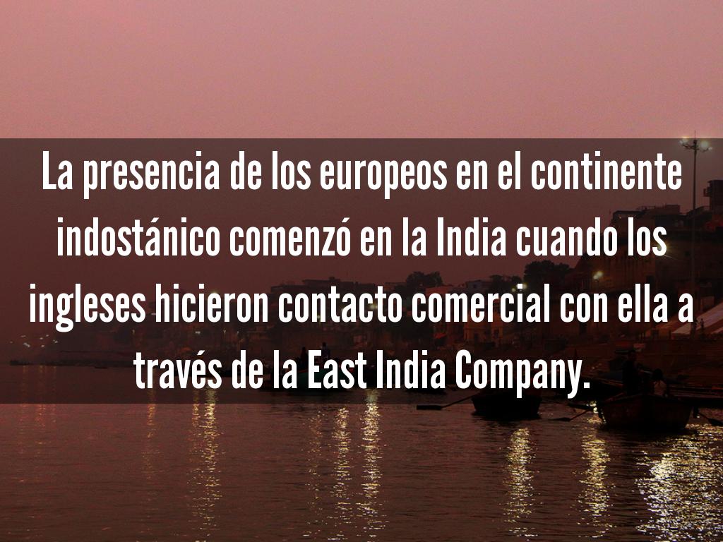 La presencia de los europeos en el continente indostánico comenzó en la India cuando los ingleses hicieron contacto comercial con ella a través de la East India Company.