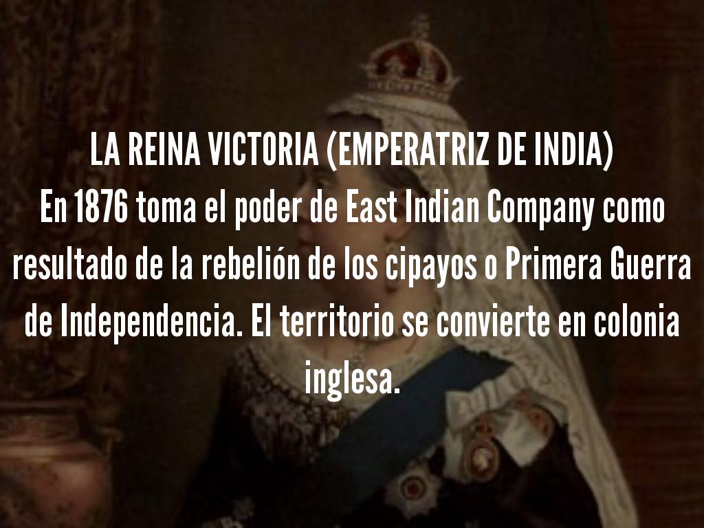 LA REINA VICTORIA (EMPERATRIZ DE INDIA) En 1876 toma el poder de East Indian Company como resultado de la rebelión de los cipayos o Primera Guerra de Independencia. El territorio se convierte en colonia inglesa.