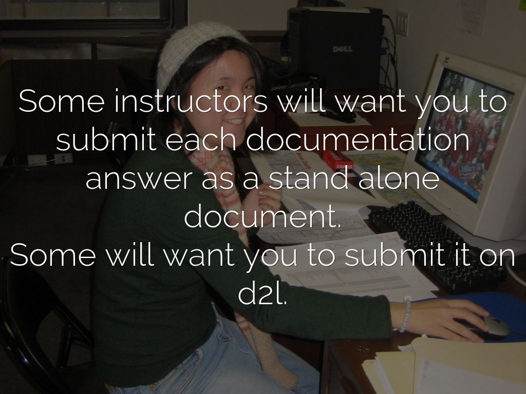 For every answer you write (for each one of the eight documentation questions), you will want to make sure you are including (in your answer) the wording of the question .