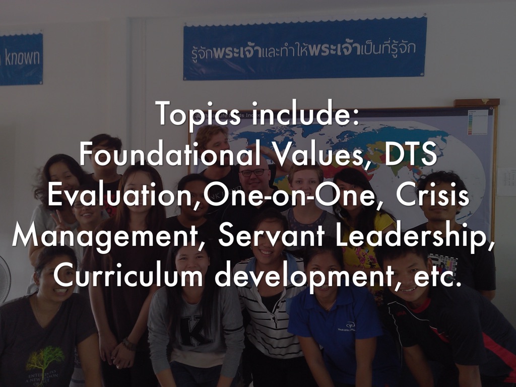 Foundational Values, DTS Evaluation,One-on-One, Crisis Management, Servant Leadership, Curriculum development, etc.