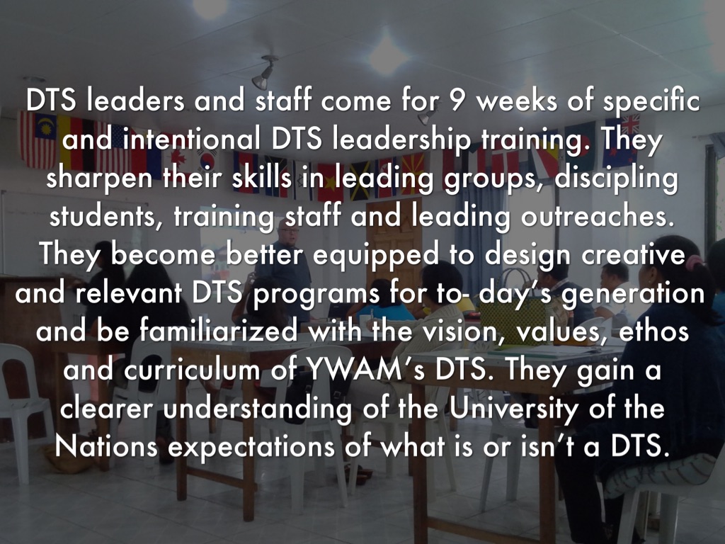 DTS leaders and staff come for 9 weeks of specific and intentional DTS leadership training. They sharpen their skills in leading groups, discipling students, training staff and leading outreaches. They become better equipped to design creative and relevant DTS programs for to- day’s generation and be familiarized with the vision, values, ethos and curriculum of YWAM’s DTS. They gain a clearer understanding of the University of the Nations expectations of what is or isn’t a DTS.