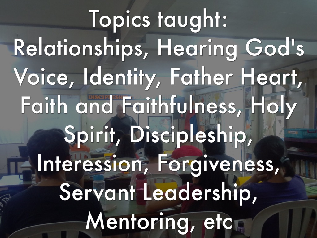 Relationships, Hearing God's Voice, Identity, Father Heart, Faith and Faithfulness, Holy Spirit, Discipleship, Interession, Forgiveness, Servant Leadership, Mentoring, etc