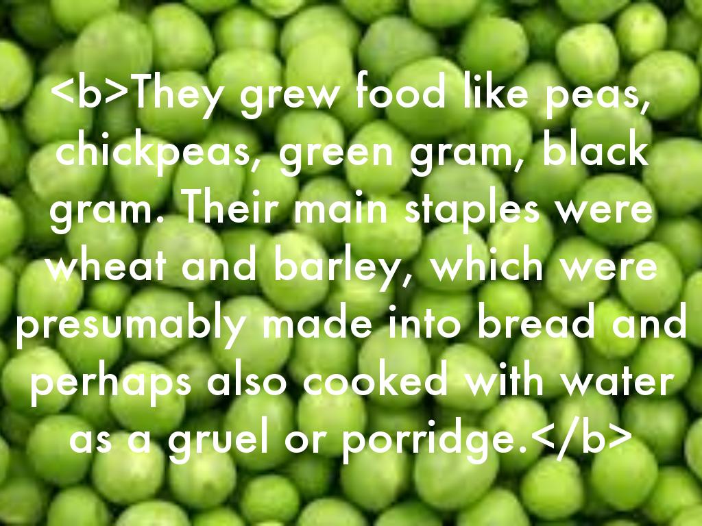 They grew food like peas, chickpeas, green gram, black gram. Their main staples were wheat and barley, which were presumably made into bread and perhaps also cooked with water as a gruel or porridge.