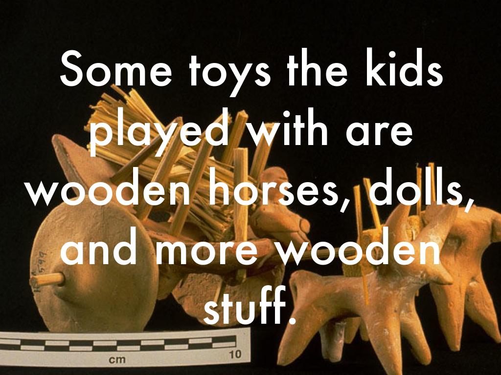 Some toys the kids played with are wooden horses, dolls, and more wooden stuff.